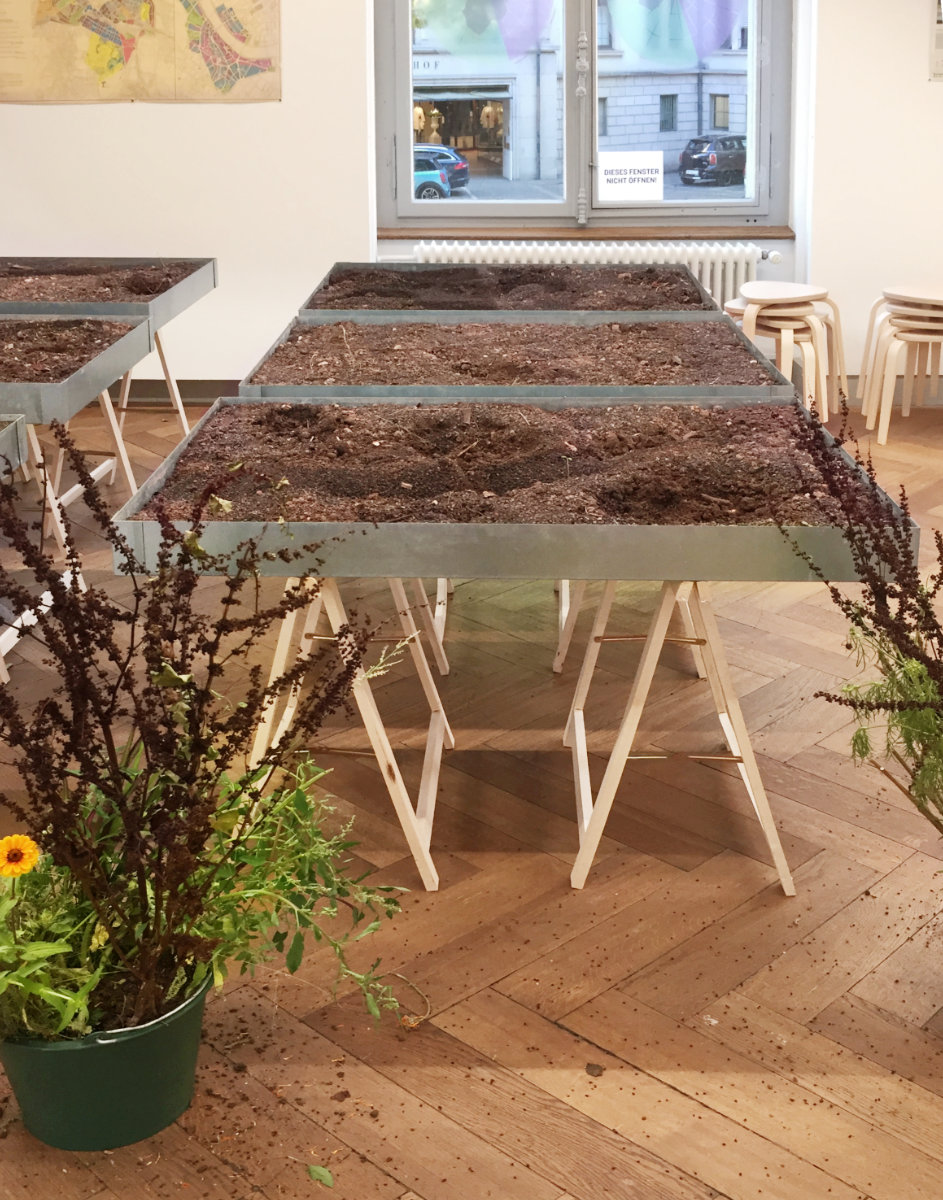 Das S AM Schweizerisches Architekturmuseum hat in Koproduktion mit der Stadtplanung Basel-Stadt eine Ausstellung und eine Reihe von Talks in Form eines Forums mit dem Titel «Basel 2050» organisiert, um zukuftstaugliches Stadtwachstum mit einem breiteren Publikum mitzudenken. Eine Raumsequenz schilderte die Zeit: das Stadtmodell von 1960 («Gestern»), das heutige Modell von 2020 («Heute») und eines mit den bekannten künftigen Bebauungen («Morgen»). Wir wurden von Studio Céline Baumann eingeladen, bei der Szenographie mitzuwirken, und haben gemeinsam ein spekulatives Modell der Zukunft für den letzten Raum konzipiert («Übermorgen») und «Terra Incognita» benannt. Das Modell bestand aus einer Schicht bepflanzter Erde, bedeckt mit gefrästen Metallplatten, die die Blockrand-Silhouette Basels nachbildeten. Die schwarze Erde steht für wertvolle Landressourcen in der gebauten Stadt und regt zur Diskussion darüber an, was bereits vorhanden ist. Gleichzeitig evoziert sie eine Ungewissheit für die Planung, indem sie die urbanen Blockränder hervorhebt, die überwiegend in Privatbesitz stehen. 2020 . TERRA INCOGNITA
