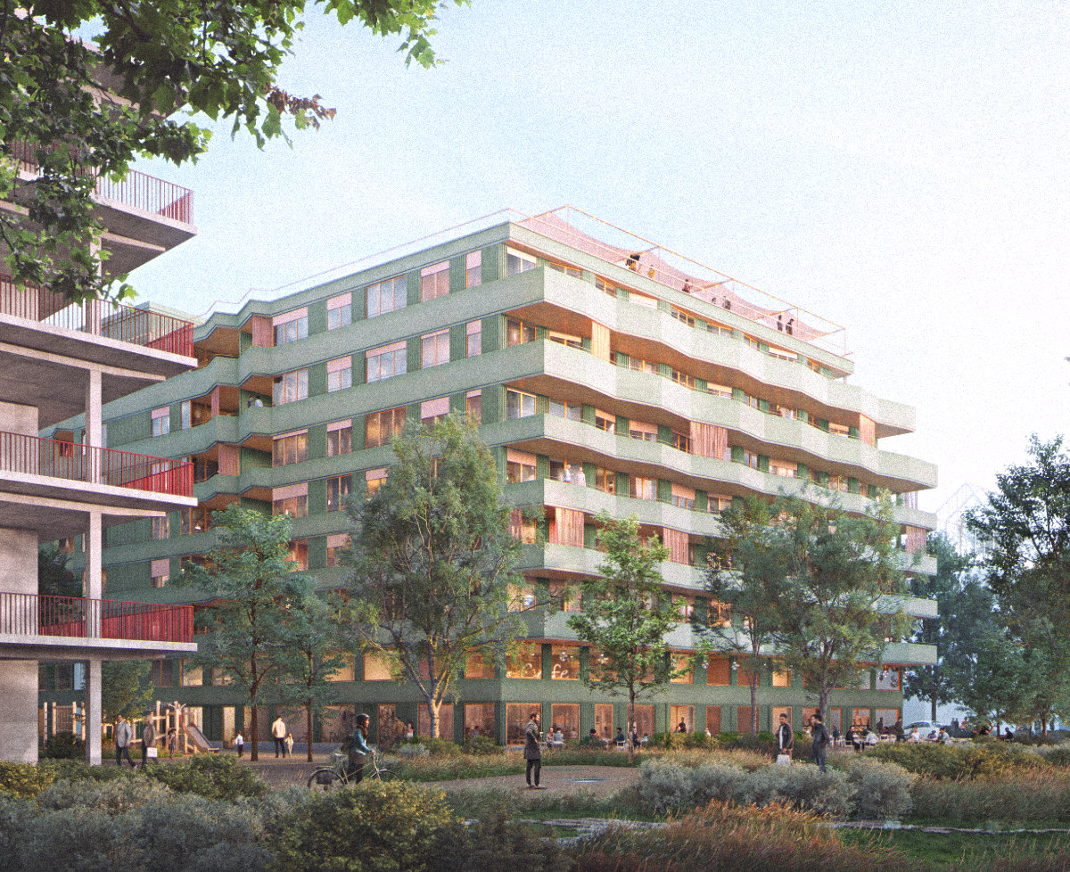 «La Svolta» plädierte für einen geschlossenen Blockrand auf der Bauparzelle, die sich unmittelbar in der Nähe des Industriegebiets Basel-Nord befindet und aufgrund dauerhafter Lärmemissionen einen besonderen Umgang benötigt. Eine bändige urbane Form zittert punktuell in leichten Schaukeln, um geschützte Loggien und halbgeschlossene Terrassen auszubilden. Durch die aussenliegenden Privatgeschossflächen wird eine Querventilation für die Wohnungen ermöglicht. Das Gebäude tritt leicht zurück und kantet sich ab, was eine Verstärkung der öffentlichen Raumsequenz — vom Schulaussenraum zur Lysbüchelplatz — zur Folge hat.