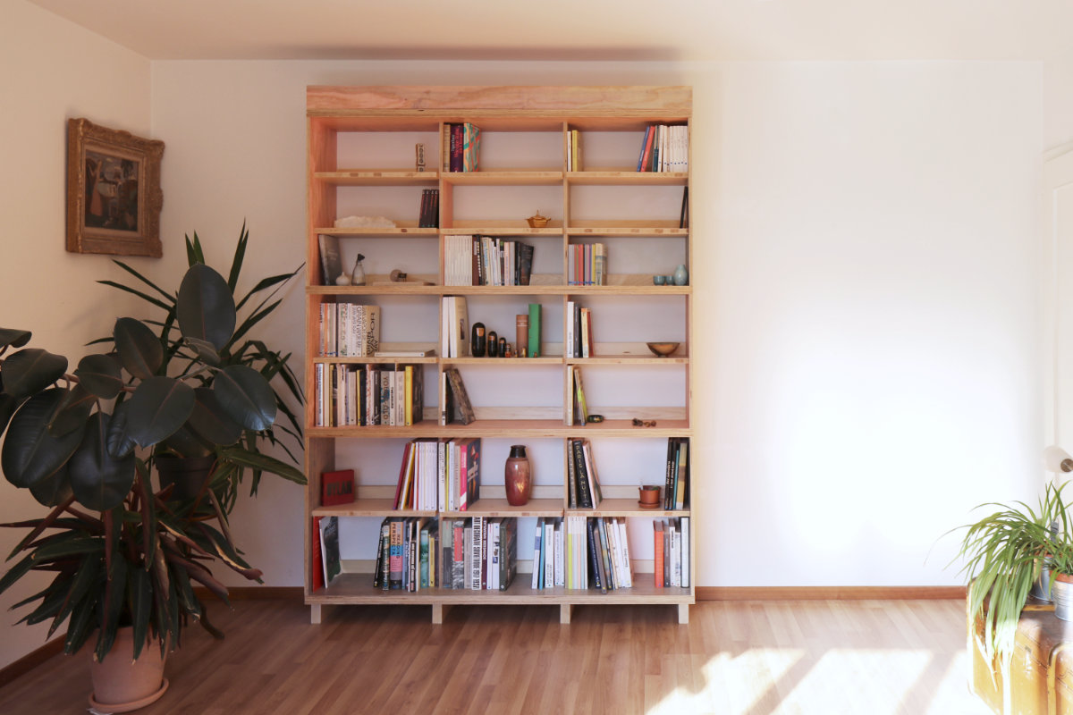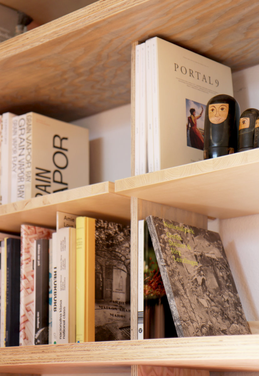«Ein Bücherregal, um 1'001 Erzählungen zu beherbergen!» Das Büchergestell ist als inkrementelle Schichtenbildung konzipiert, mit hohen Fächern von unten beginnend – wo Kunstbücher und gewichtige Kompendien beherbergt sind – bis nach oben hin immer niedriger werdend, wo politische oder wirtschaftliche Traktate und Romane Platz finden.