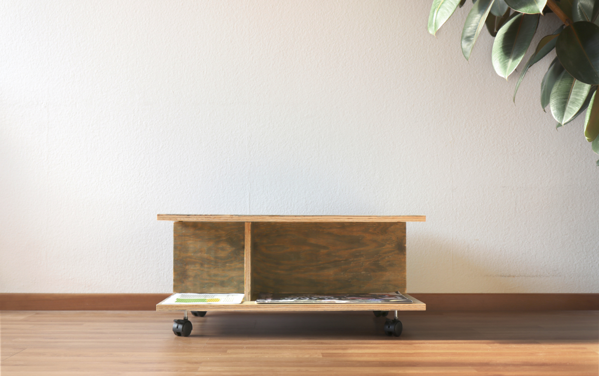 Auftrag für mehrere Möbelstücke für eine Kleinwohnung mit reichlich Bedarf an geschlossenen und offenen Abstellmöglichkeiten. Beweglicher Kaffeetisch mit vier Fächern, nach gängigen Papierformaten dimensioniert, um Lesestoff stapeln zu können.