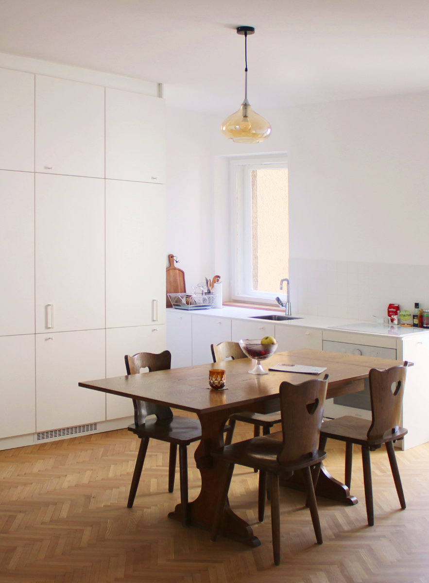 Im ursprünglichen Grundriss aus dem Jahr 1954 war eine kompakte, funktionale Küche samt kleinen Lüftungsfenster in einer Nische untergebracht, die nur vom Speisezimmer aus zugänglich war. Unser Vorschlag sah eine Rotation von Badezimmer und Küche um die Steigzone vor, sodass die Küche in der Mitte der Wohnung positioniert werden konnte, um als Herdstelle zu fungieren. Unmittelbar neben dem Eingang gelegen, befindet sich die Küche nun zentral zwischen Wohnzimmer und Balkon. Der Umbau bot die Chance, eine zweite Balkontür einzufügen, was eine neue Bewegungsdynamik in der Wohnung zur Folge hat – im starken Kontrast zur zellenförmigen Ordnungslogik der Einzelzimmer zuvor.