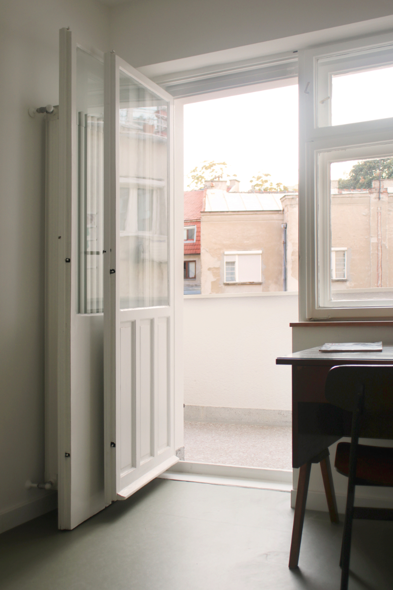Der Umbau beinhaltete die Restaurierung der Balkonkastentüren und Kastenfenstern, die – typisch für den Bauart der 1950er-Jahre – über einen äusseren Hauptflügel und einen inneren Winterflügel verfügen, passend zum Kontinentalklima in Osteuropa. Die Paneele benötigten kleinere Reparaturen an den Griffen sowie eine Erneuerung aller Wetterschenkel. Anschliessend wurden sie sorgfältig lackiert und wieder montiert. Eine thermische Dämmung wurde an der Innenseite der Fassadenwand angebracht; entsprechend wurden sämtliche inneren Fensterbänke ersetz.
