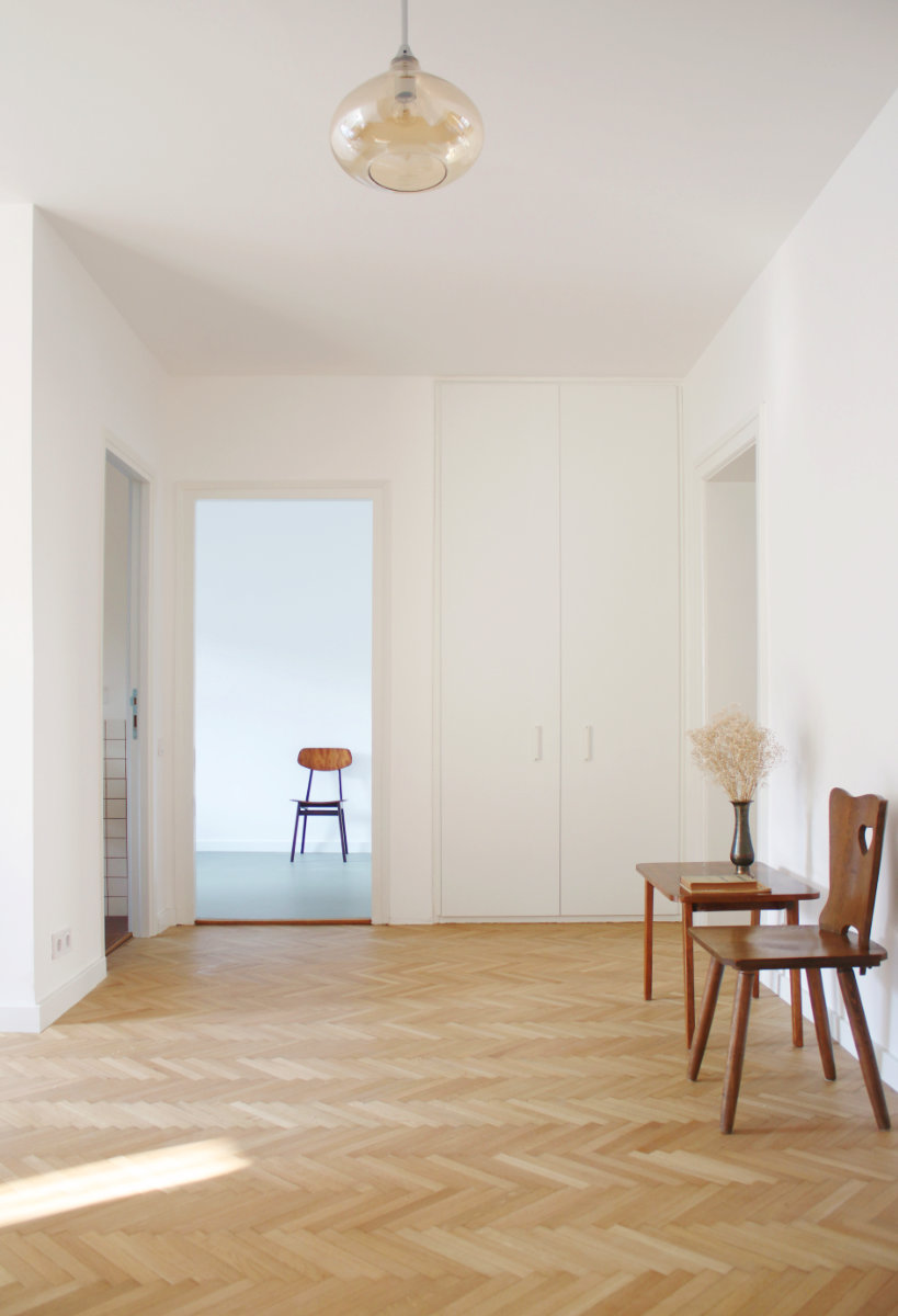 Der Umbau einer Wohnung in der Cvijićeva ulica, Belgrad, umfasste die Entfernung eines Mauerteils in der Eingangshalle, um Tageslicht quer durch die Wohnung zu bringen. Dies entlastet die Halle als Raumverteiler und schafft weichere räumliche Übergänge. Das originale Fischgrätparkett wurde sorgfältig erhalten und auf unsichtbare Weise dort ergänzt, wo durch die Wandentfernung eine Lücke entstanden war.