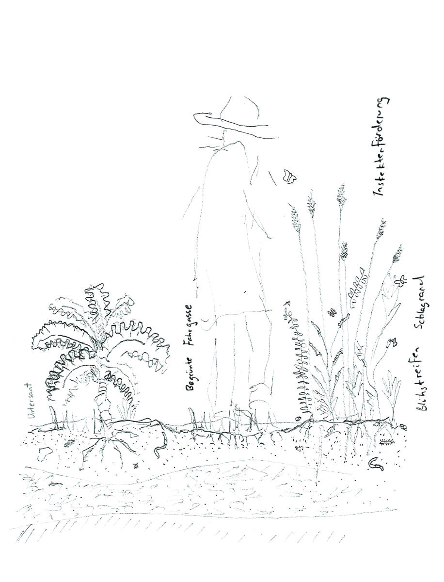 «Ein Gartenarchipel» enthält ein vertieftes Porträt des Basler Solawi-Betriebs plankton—der Gemüsekooperative aus der Stadt—und dessen Bodenpraktiken. Das Potential für die öffentliche Unterstützung solcher Initiativen im Hinblick auf klimatische und ökologische Planungsziele wird dabei geschildert. Zugleich ist es ein Toolkit um Wissen an jene weiterzugeben, die ähnliche Projekte aufstellen möchten. Oben ist eine Pflanzungsstrategie skizziert, bei der an bestimmten Stellen Nützlings- und Blühstreifen ausgesät sind, zum Beispiel mit Kornblumen, Phacelia, Sonnenblumen oder Buchweizen, die bestäubende Insekten und Nützlinge zur ntäurlichen Schädlingsbekämpfung anlocken. 2024 . EIN GARTENARCHIPEL