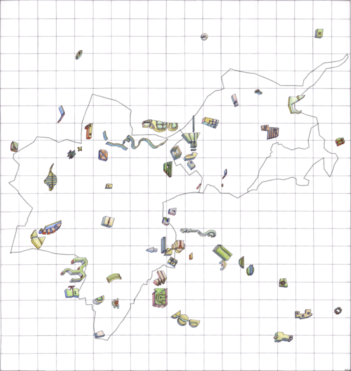 Abstrakte Collage in Anlehnung an die Vision von Berlin als «Städtearchipel in einer grünen Naturlagune» von O.M. Ungers. Dargestellt wird jedoch nicht eine fragmentierte Stadt im grünen See, sondern ein Archipel kollektiver Versorgungsgärten, die in einer Stadtlagune liegen und zur Reduktion von CO2-Emissionen beitragen. Mit dem Zuwachs aktiver Communities und Produktionsgärten steigt die klimatische Relevanz. 2024 . EIN GARTENARCHIPEL